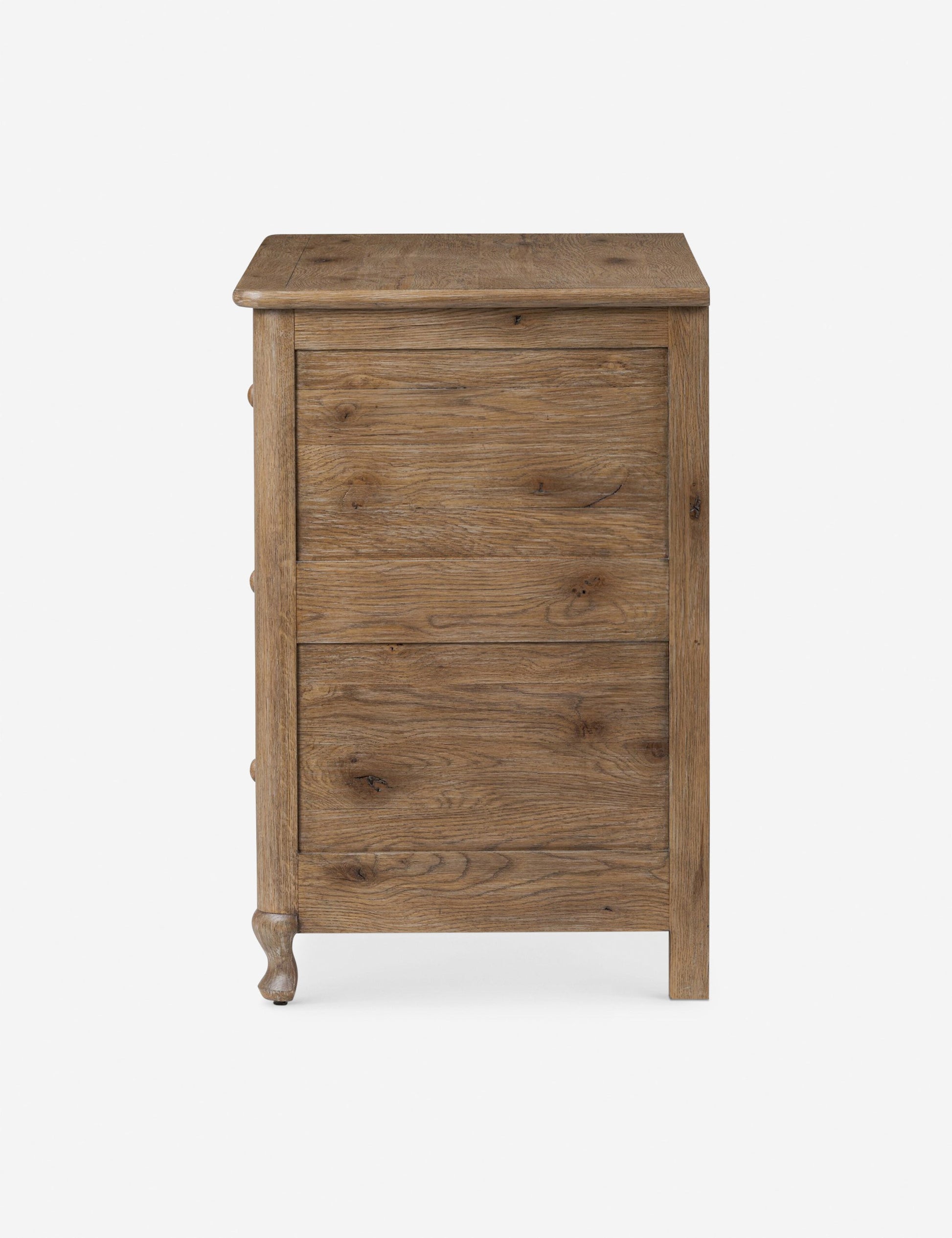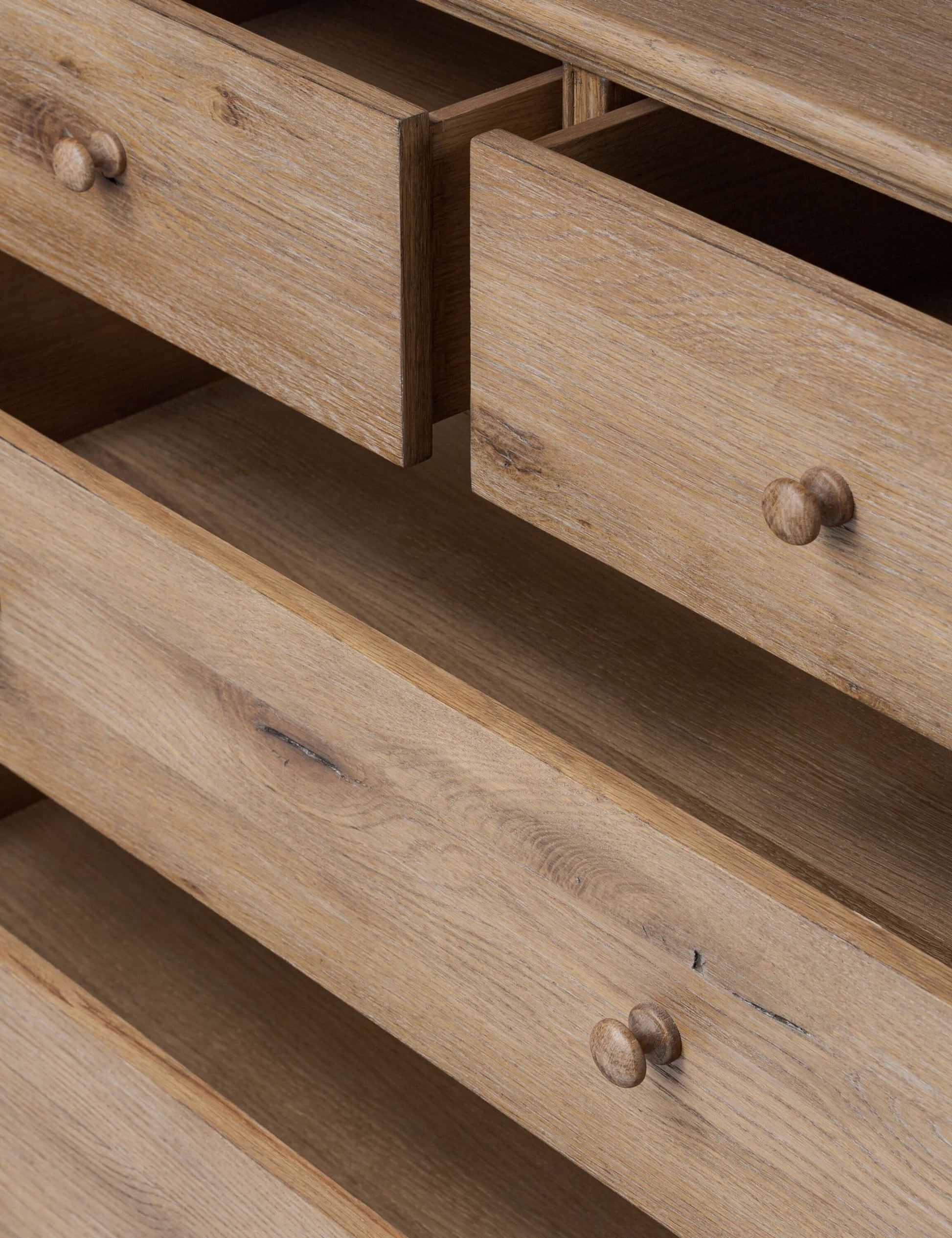 La commode Caraway apporte une touche d'élégance à votre chambre. Fabriquée en chêne massif patiné avec des ferrures en bois tourné, elle présente des pieds décoratifs et des moulures autour des tiroirs et des portes. Cette petite commode deviendra un incontournable de votre chambre ou apportera une touche chaleureuse à votre espace invité grâce à son grain naturel.