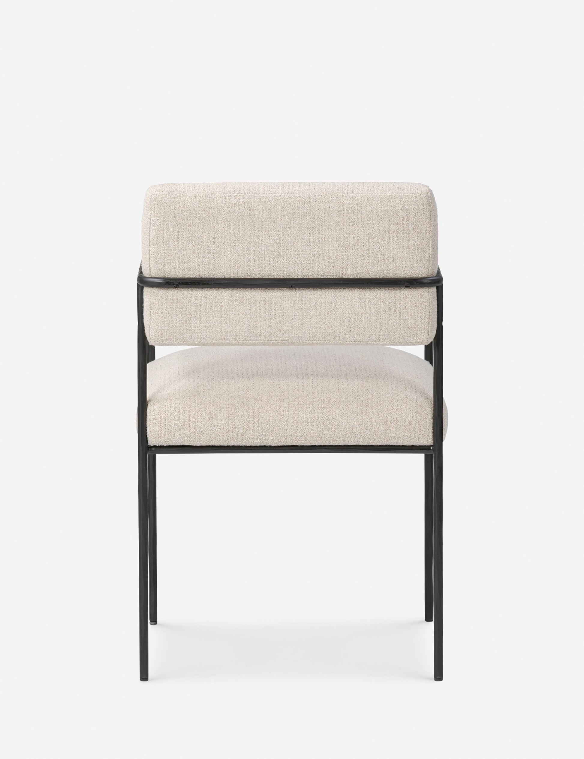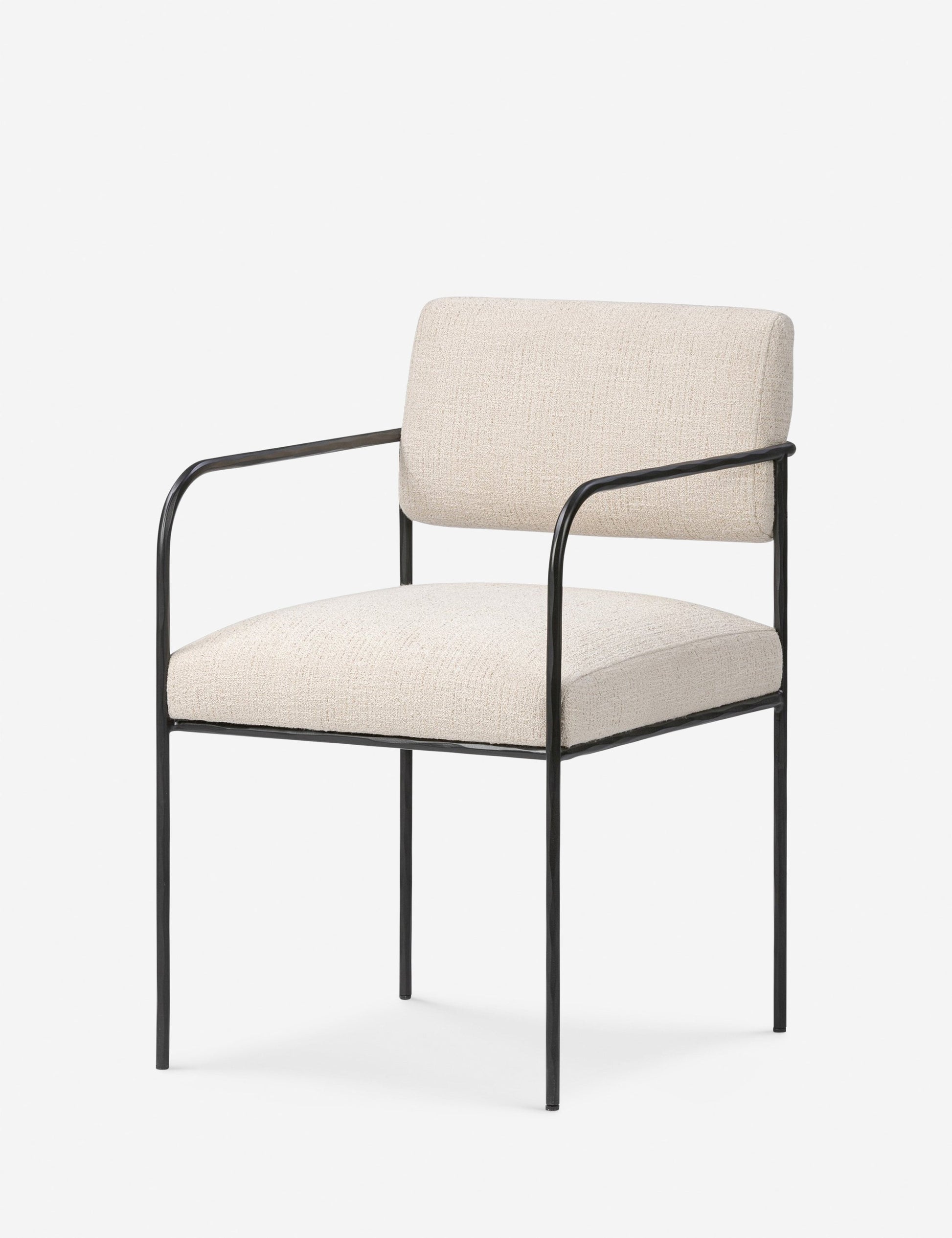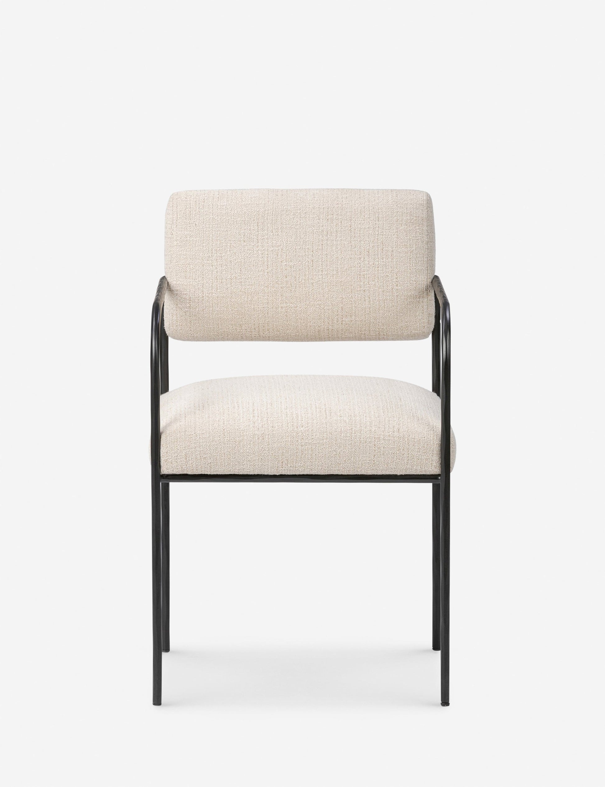 La chaise de salle à manger Consuelo offre des lignes épurées et une texture contrastée pour l'extérieur. Sa fine structure en fer martelé soutient une assise et un dossier rembourrés en tissu performant crème. Cette chaise est une option élégante et durable pour les repas en plein air.