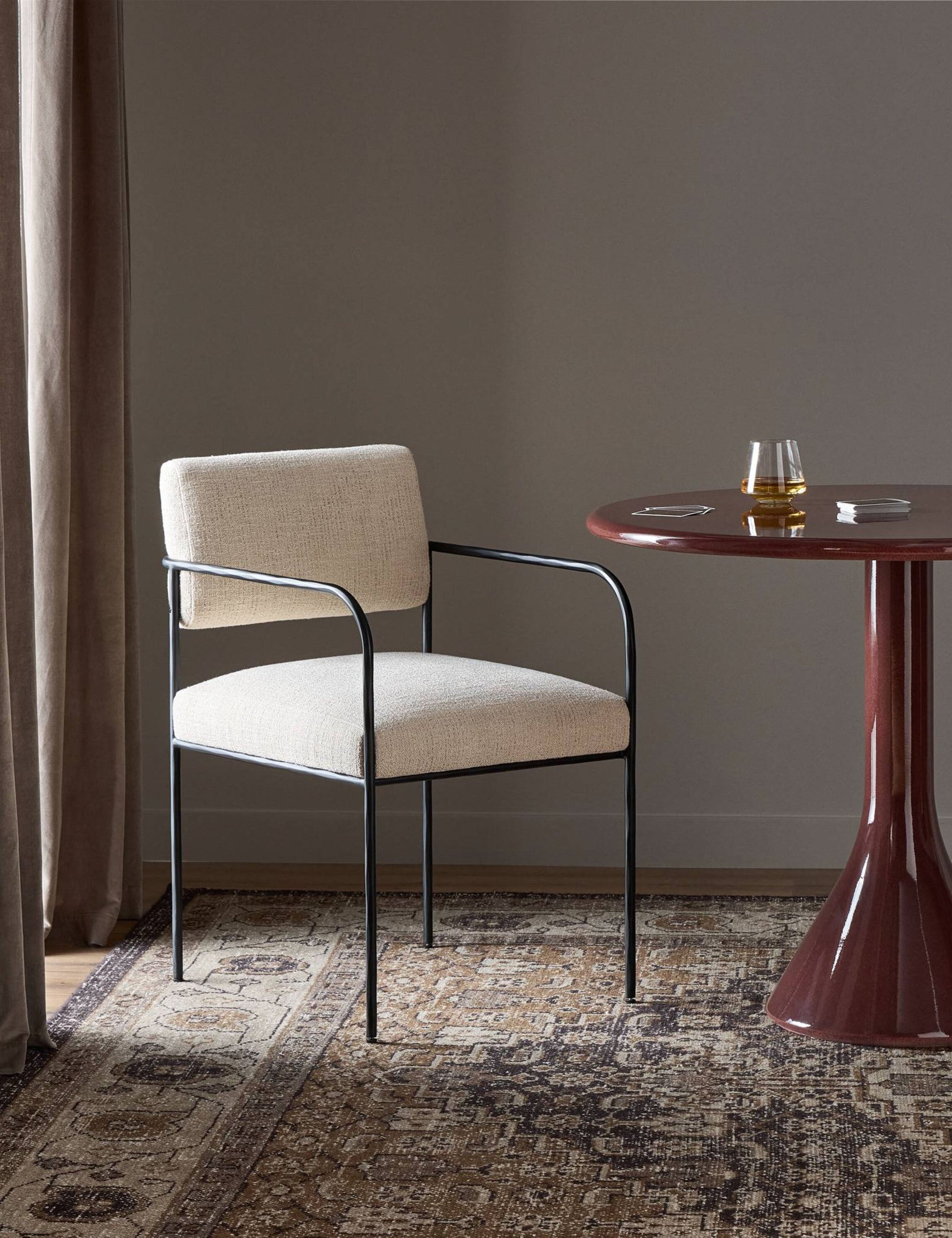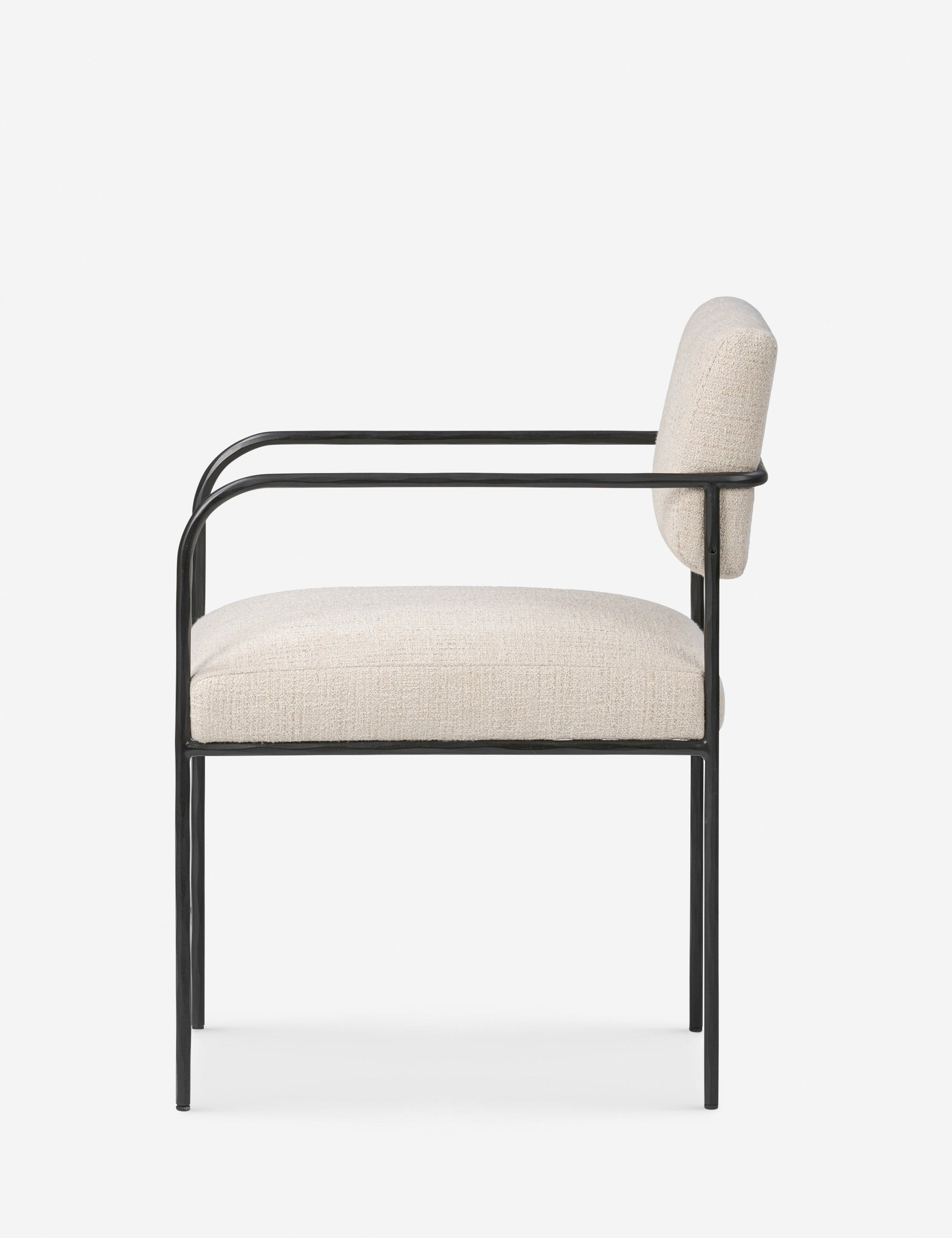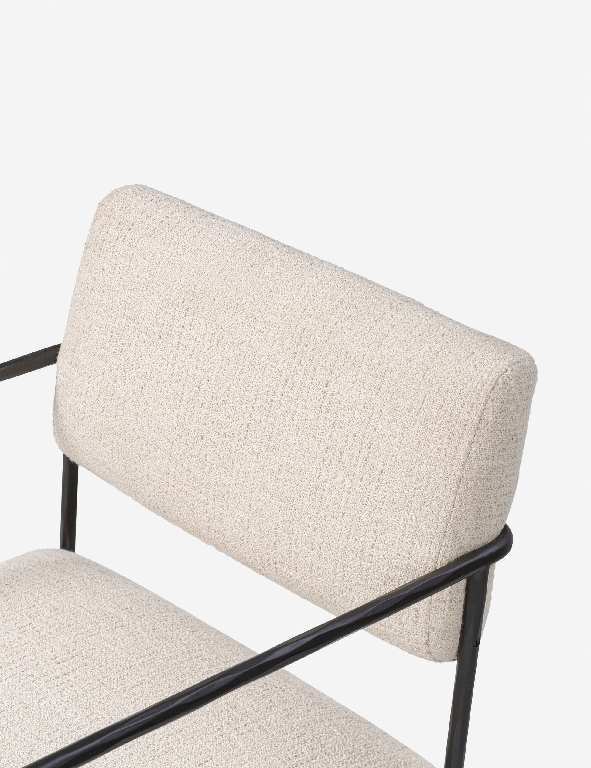 La chaise de salle à manger Consuelo offre des lignes épurées et une texture contrastée pour l'extérieur. Sa fine structure en fer martelé soutient une assise et un dossier rembourrés en tissu performant crème. Cette chaise est une option élégante et durable pour les repas en plein air.
