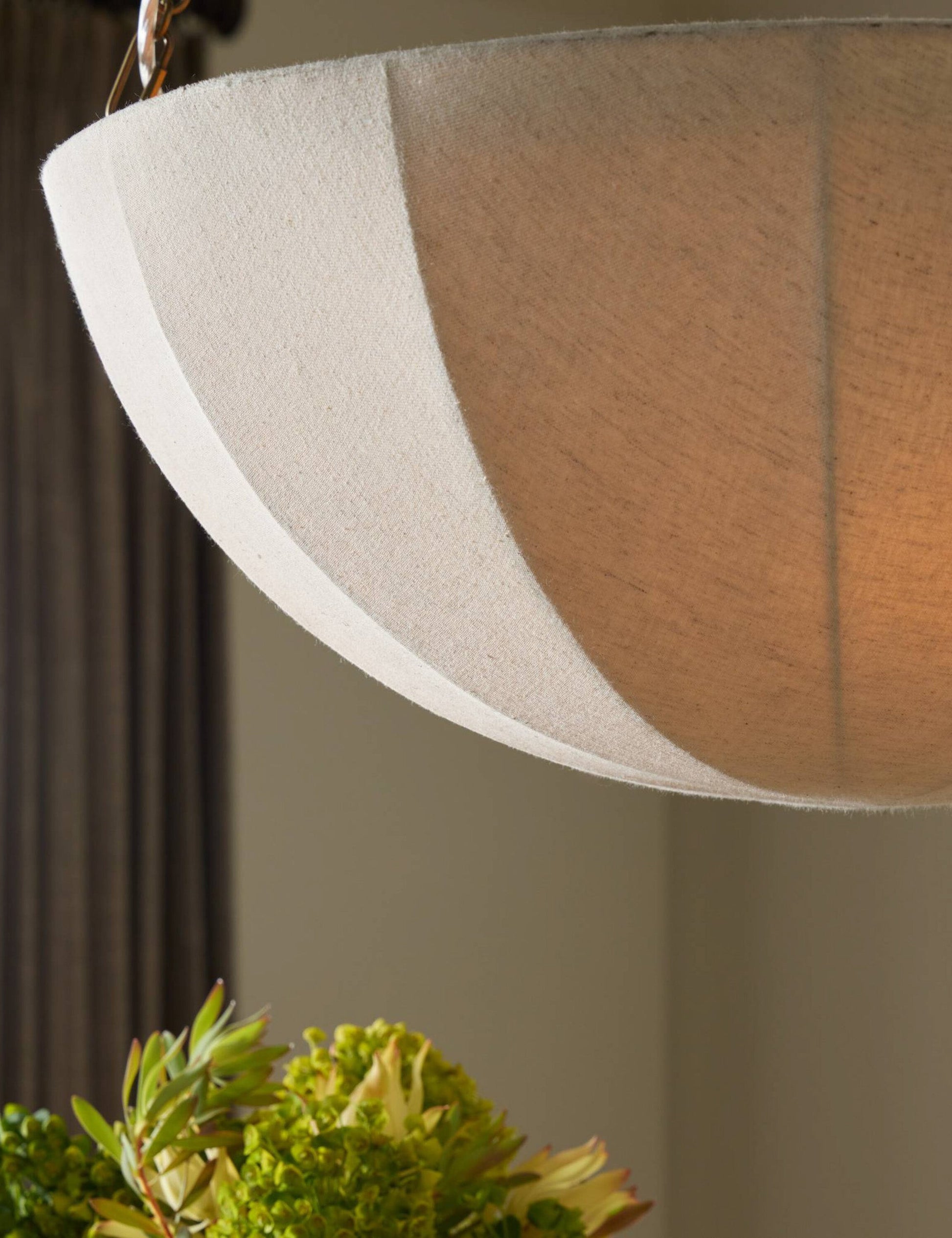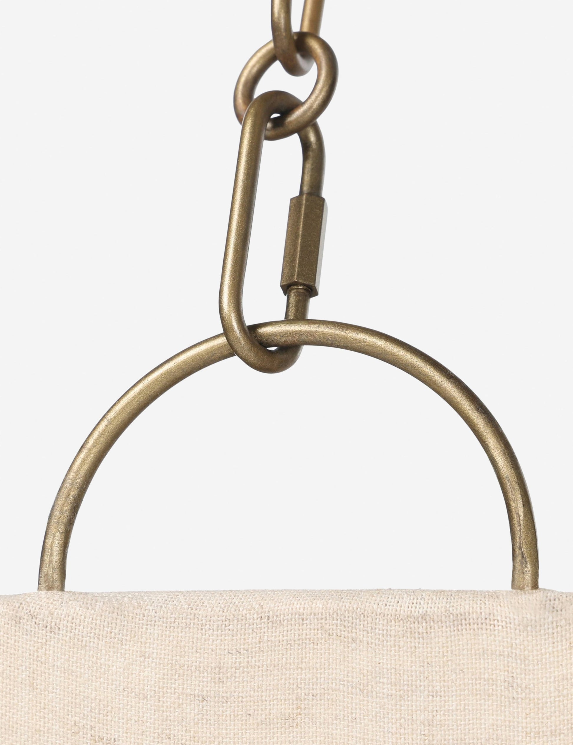 Suspension parasol à l'impact aérien, Mahan associe une chaîne en laiton à un abat-jour gainé de lin pour une diffusion douce. Sa simplicité sculpturale offre chaleur et équilibre, faisant de cette suspension un plafonnier élégant pour les salles à manger ou les entrées.