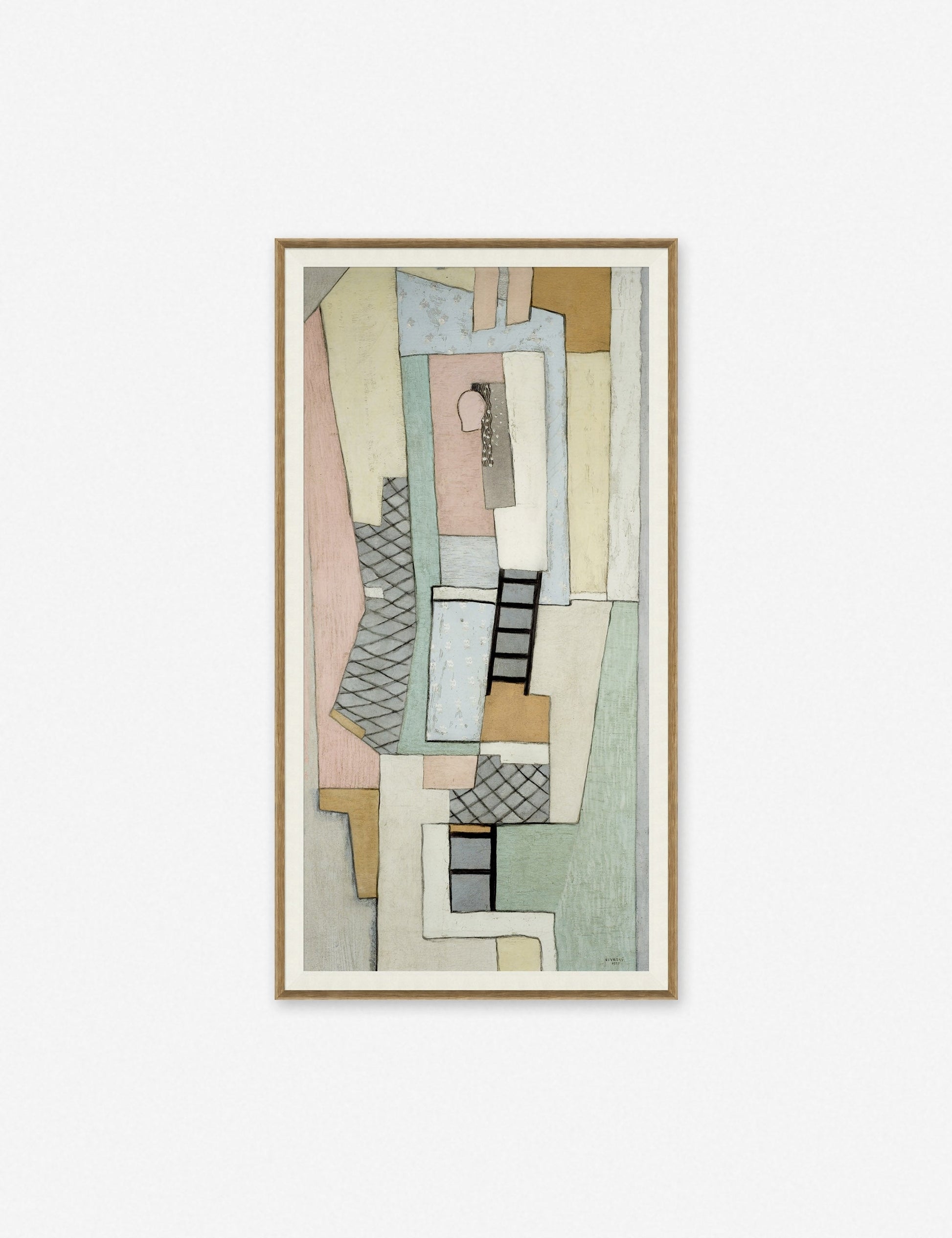 Tons doux et formes géométriques sont les vedettes de cette décoration murale d'inspiration cubiste. Cette affiche encadrée offre un style abstrait polyvalent, parfait pour les intérieurs modernes et lumineux.