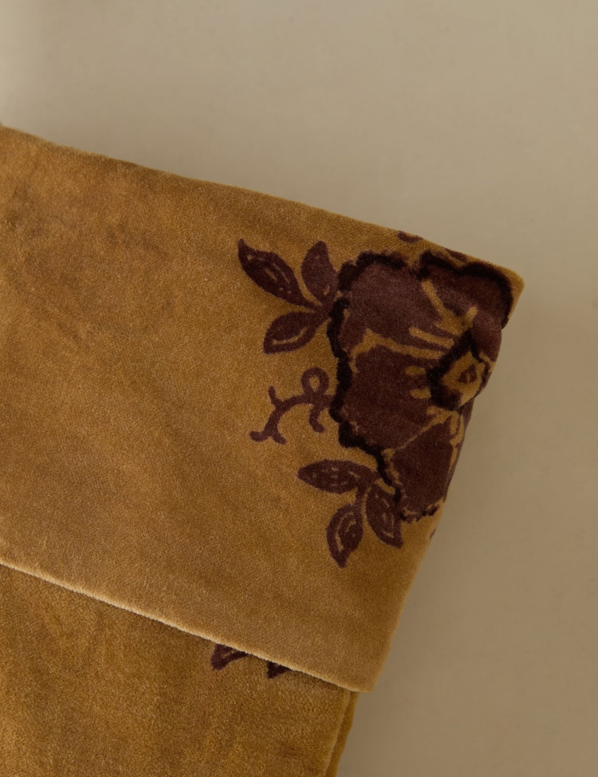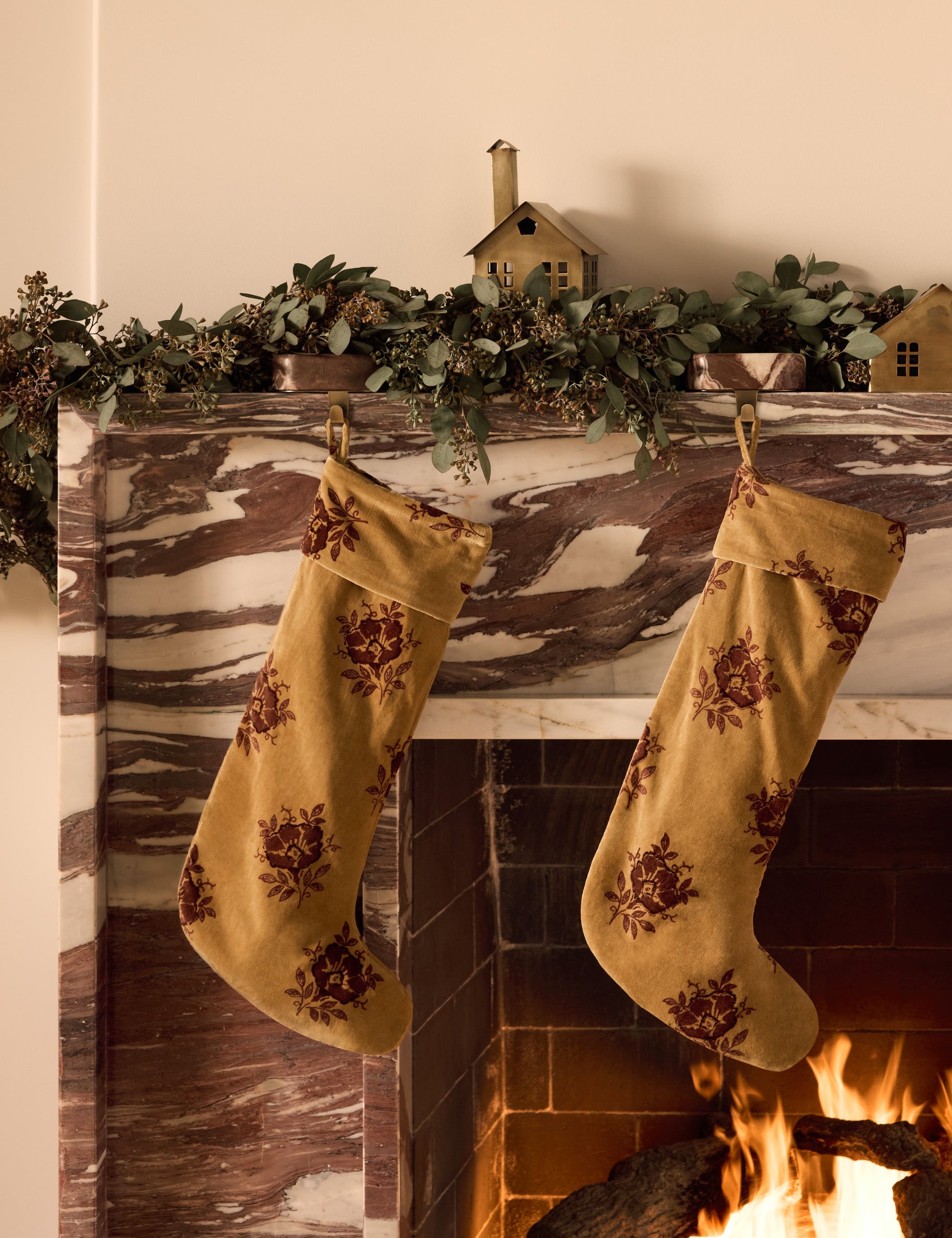 Notre bas de Noël Montréal revisite un style intemporel avec la touche luxueuse du velours. Un délicat motif floral orne un champ ouvert, ajoutant une touche intemporelle à votre collection des Fêtes.