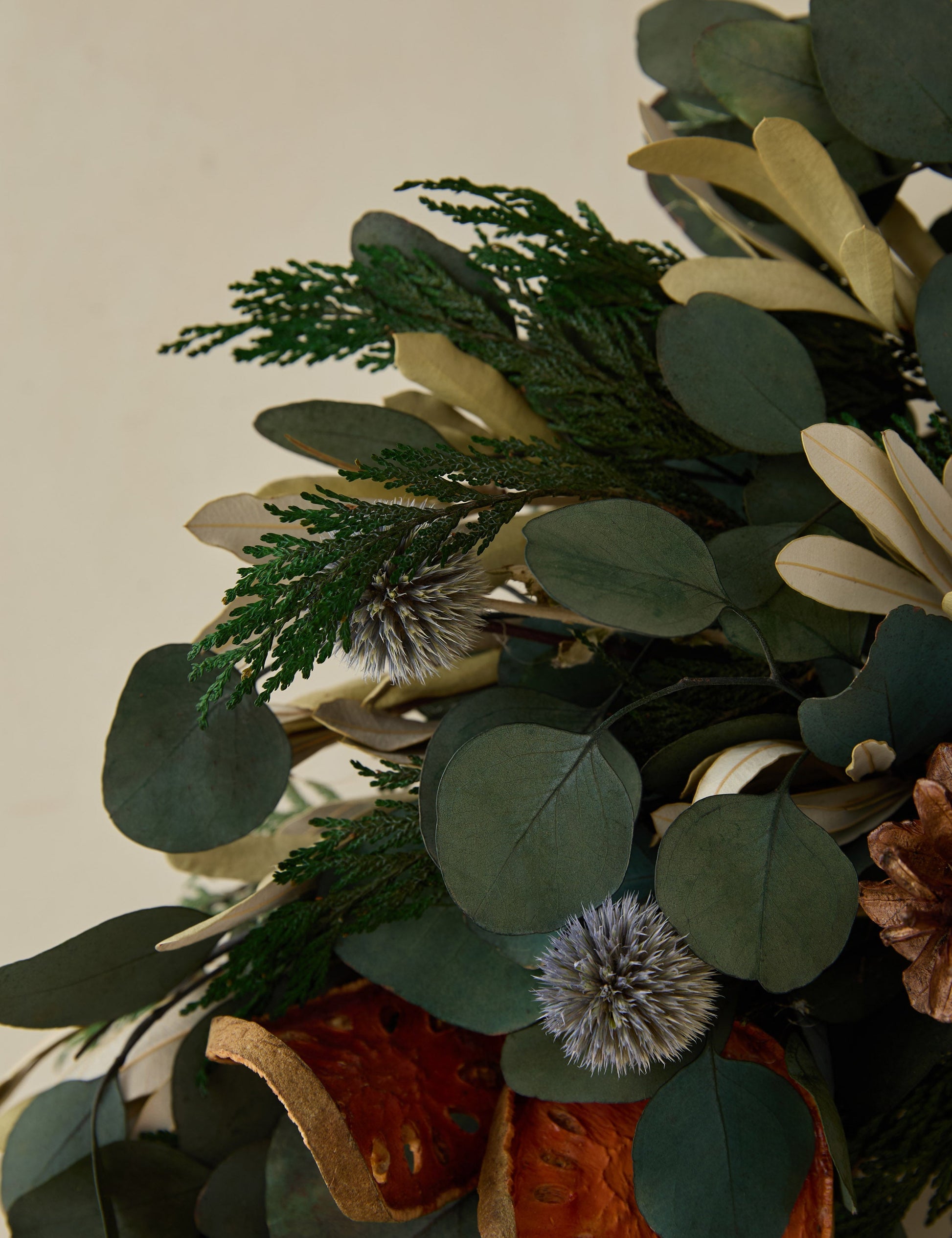 Texturée et parfumée, cette couronne associe des feuilles de cèdre et de dollar d'argent stabilisées à des tranches de coing et des pommes de pin pour une touche luxuriante et saisonnière. Ses verts vibrants et ses touches colorées réchauffent votre décoration et lui apportent une touche réconfortante.