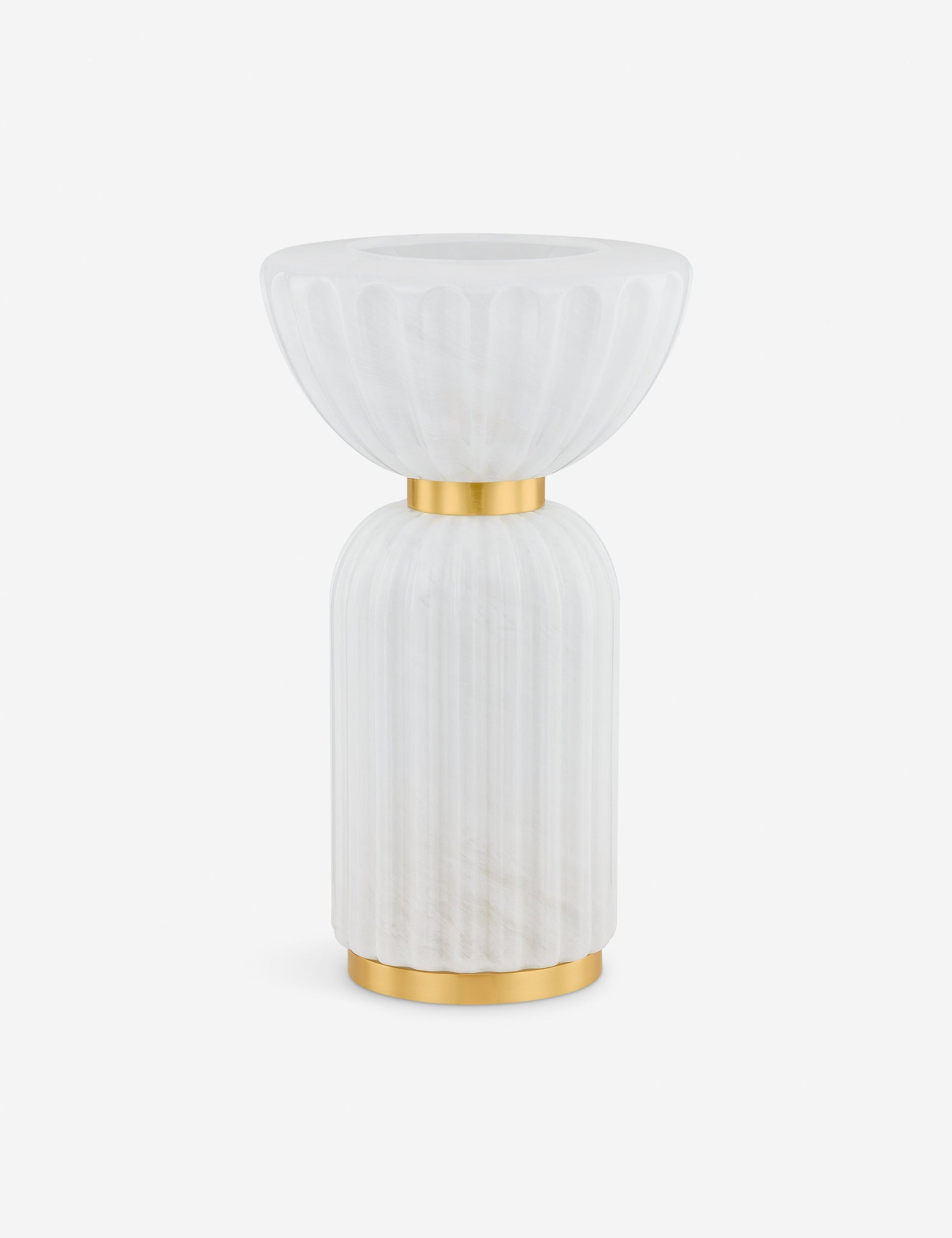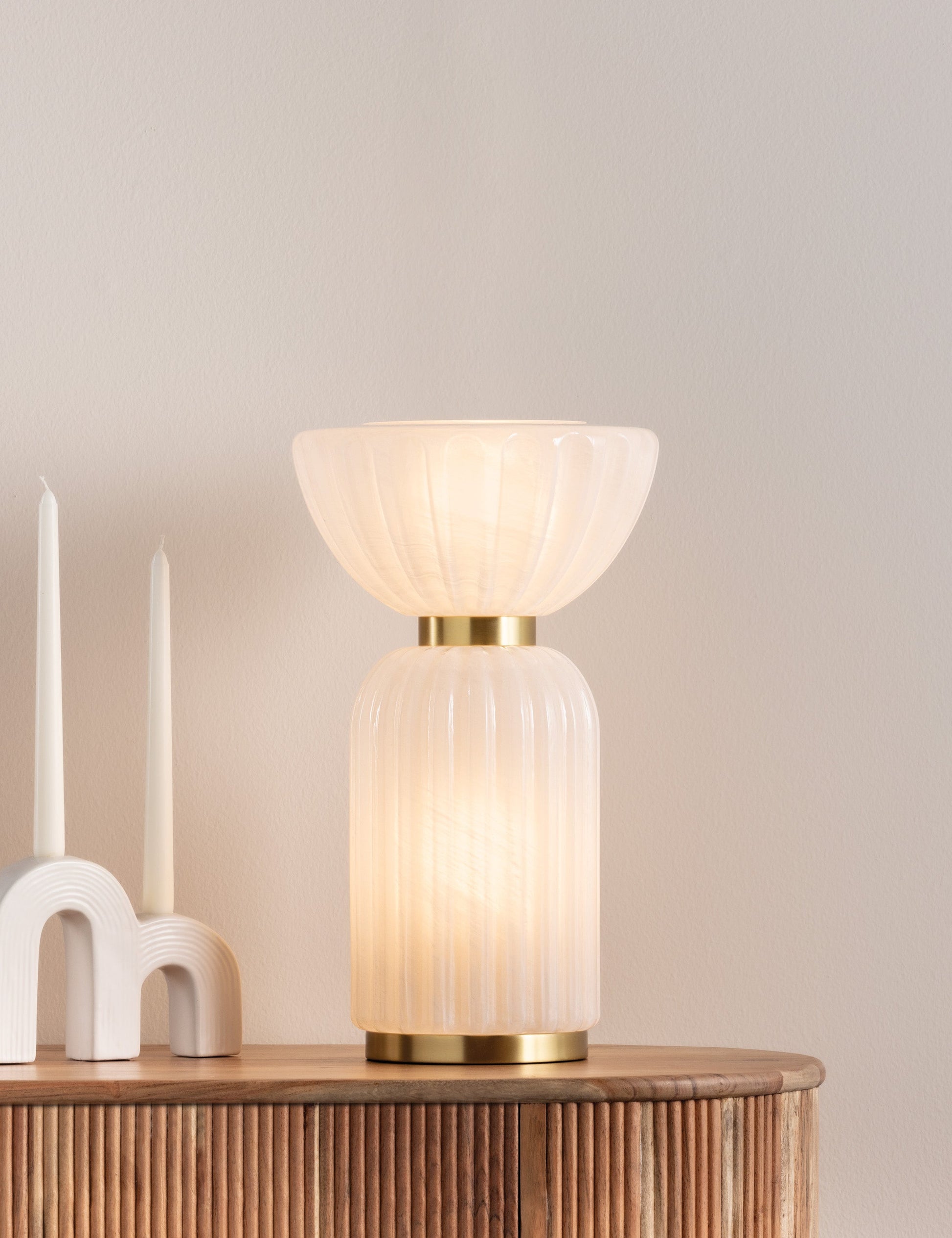 La lampe Sopra s'inspire des formes architecturales classiques avec une touche de modernité. Sa base en verre cannelé et son dôme inversé créent une colonne lumineuse lorsqu'elle est allumée, sublimée par de subtils accents de laiton et des stries laiteuses dans le verre nuageux. Cette lampe de table apporte une beauté sculpturale et une lumière douce à n'importe quel bureau ou surface.