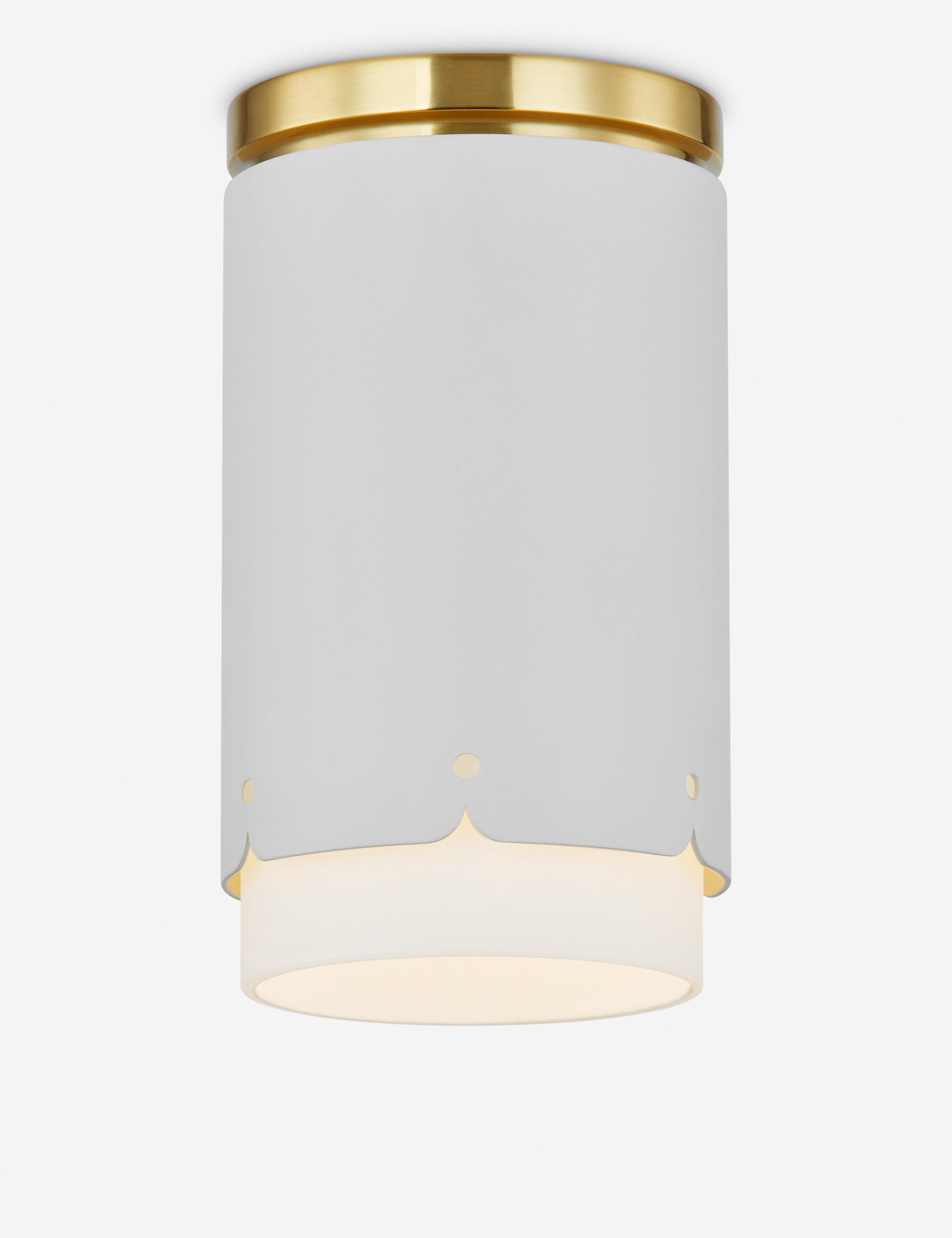Trenet réinvente l'éclairage de plafond avec des détails sculpturaux et un impact discret. Une bande de verre opale mat diffuse la lumière uniformément, bordée d'une garniture métallique festonnée aux perforations subtiles. Ce plafonnier apporte une touche finale sur mesure aux cuisines, couloirs ou salles de bains au style épuré.
